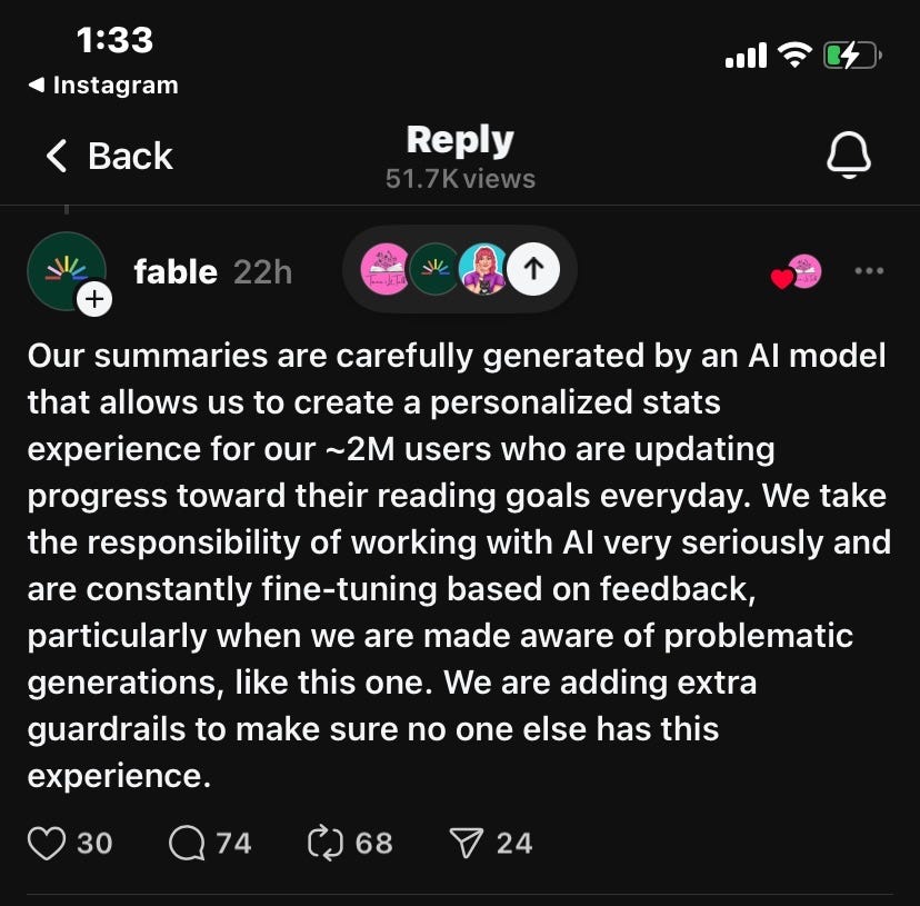 I have no idea if Fable’s response was also generated by AI, but it does have that feel of being a long winded response on social media with little substance and a serious lack of apology.